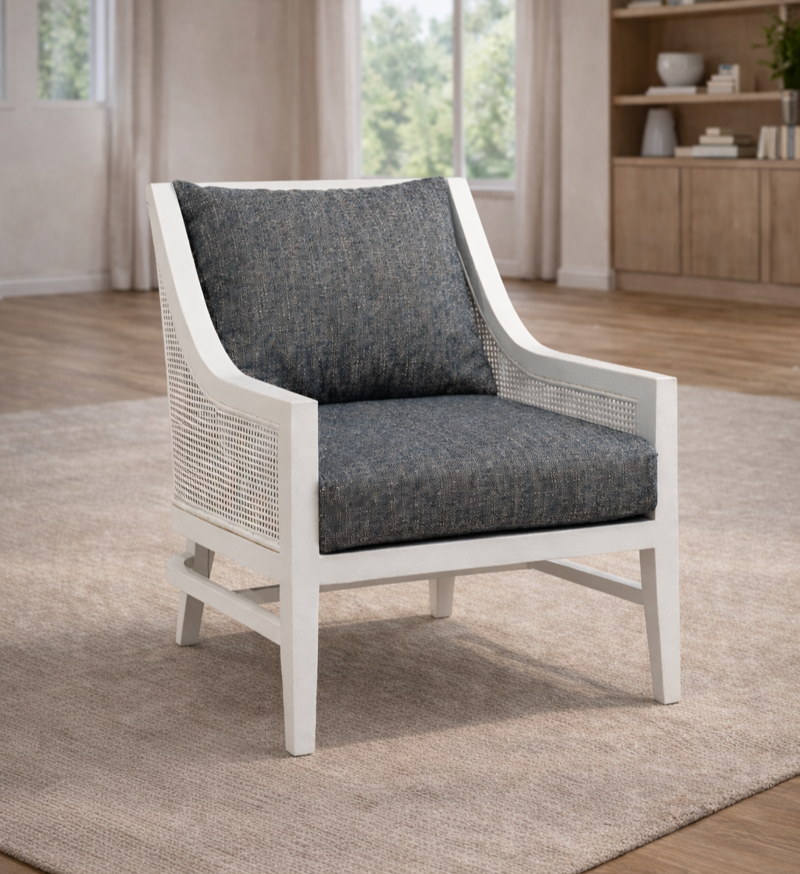 The Corfu Accent chair is crafted with a solid white mahogany wood frame for enduring strength and style. The neutral-toned cushions offer a cozy yet supportive seat, making it an ideal addition to any lounge or living area. Perfectly suited for contemporary and classic interiors alike.
