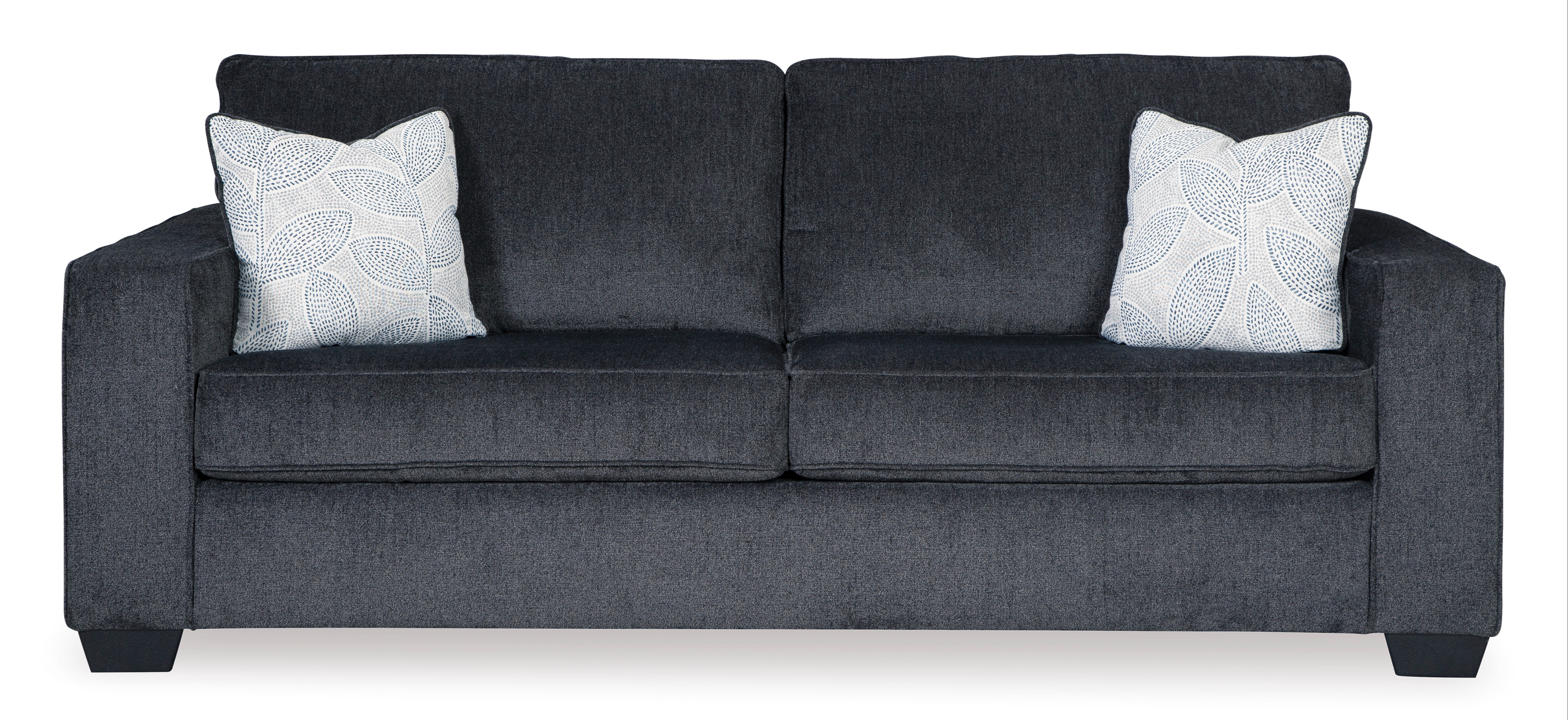 When style is the question, this eye-catching sofa is the answer. Featuring clean lines and sleek track arms, its contemporary design is enhanced by plush cushioning and a chenille-like upholstery that feels wonderfully soft to the touch. Finished in a versatile slate, this sofa complements a wide range of color schemes and includes two subtly patterned floral pillows for a fresh, stylish accent.