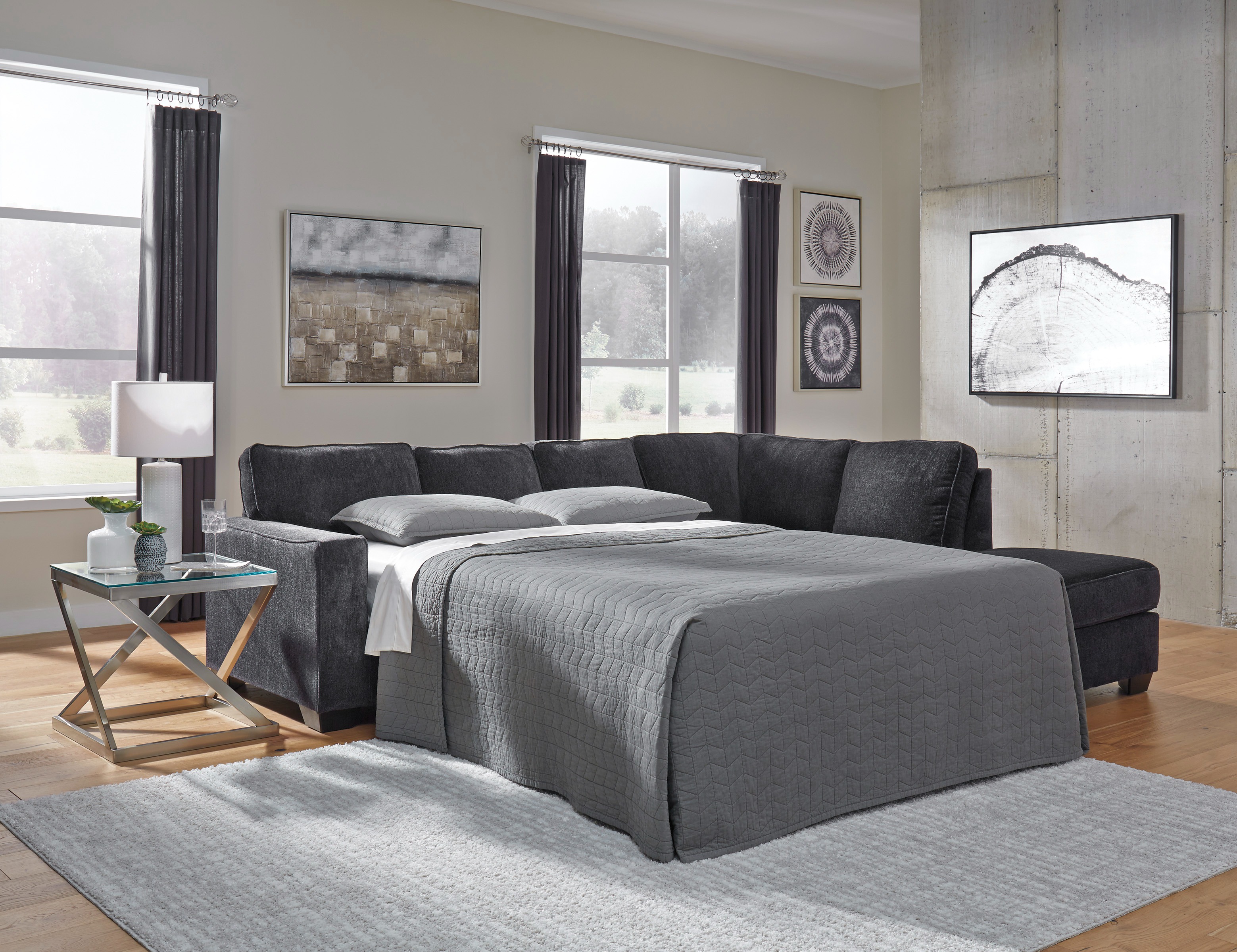 If style is the question, then this sleeper sectional is the answer. Sporting clean lines and sleek track arms, its decidedly contemporary profile is enhanced with plump cushioning and chenille-feel upholstery, so pleasing to the touch. This sleeper sectional in a richly neutral slate is sure to complement a variety of color schemes, while the understated floral-patterned pillows bring a fresh, fashionable appeal. Crafted with quality memory foam, the pull-out full mattress comfortably accommodates overnight guests.