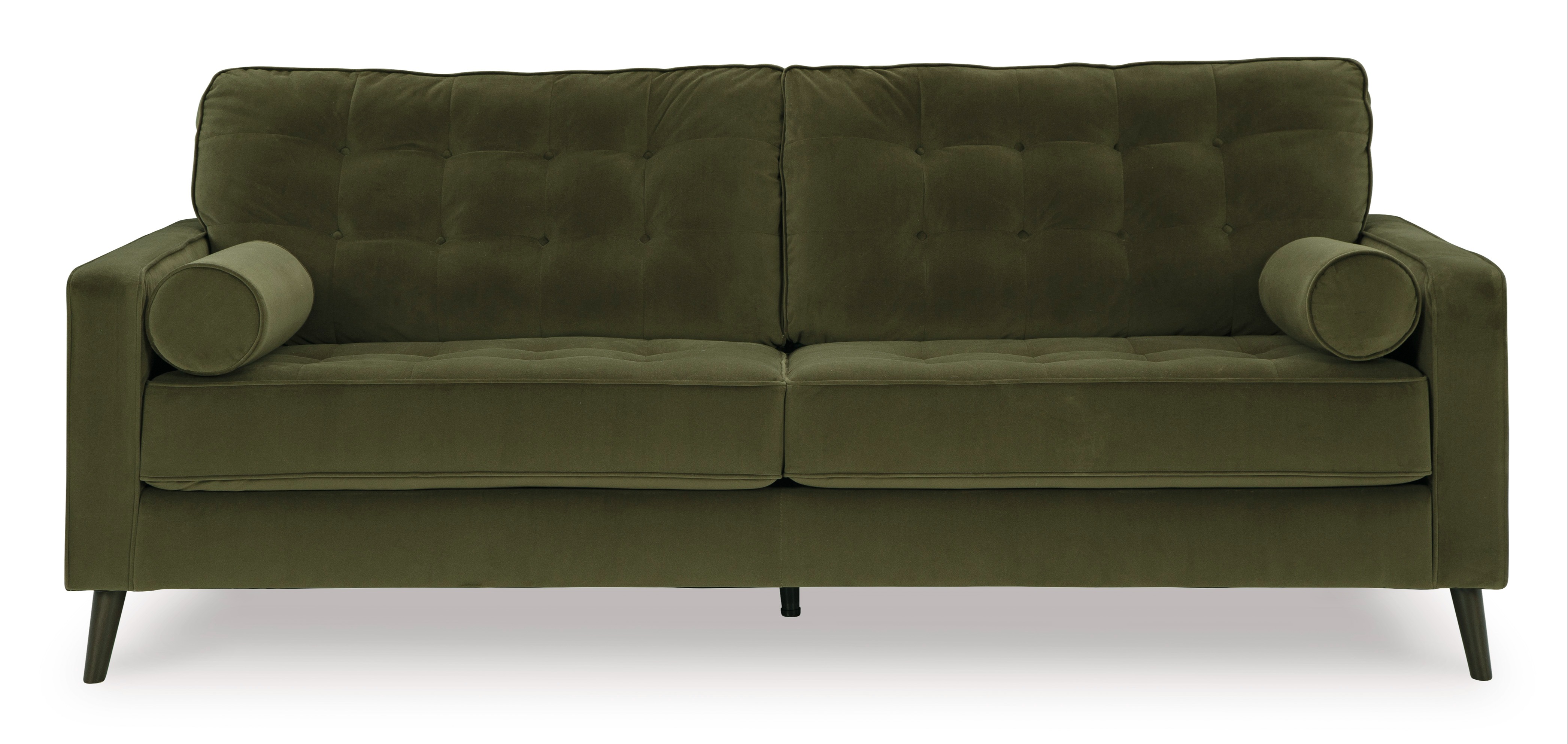 This sofa strikes the perfect balance between elevated and eclectic. Contemporary lines and a richly hued velvet upholstery keep things chic. Design details like button tufting and splay legs add mod flair. It’s sure to keep your living room luxuriously on trend—at a price that won’t break the bank.