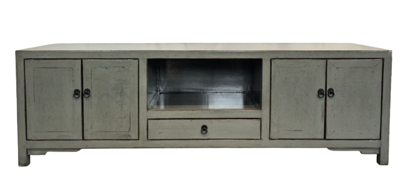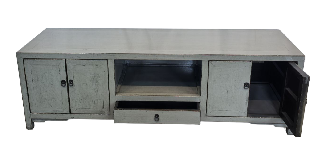 Featuring multiple compartments for media and storage, this piece is crafted from multi-layer board and recycled pine, combining durability with a distinctive, character-rich finish.