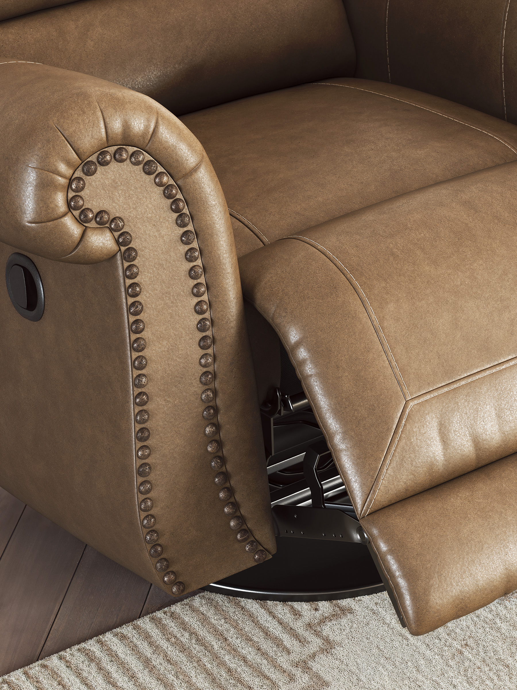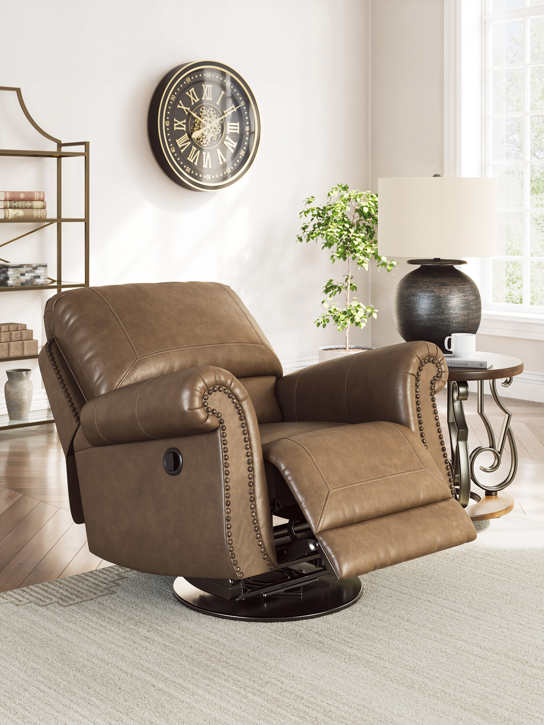This beautifully crafted recliner in rich, faux leather upholstery combines rustic charm with modern durability. The recliner's comfy, durable cushions—wrapped in a rustic yet sophisticated faux leather—keep you feeling relaxed, while its turned legs show that style and quality flow from top to bottom. Plus the smooth reclining motion and 360-degree swivel keep you in the flow of conversation.