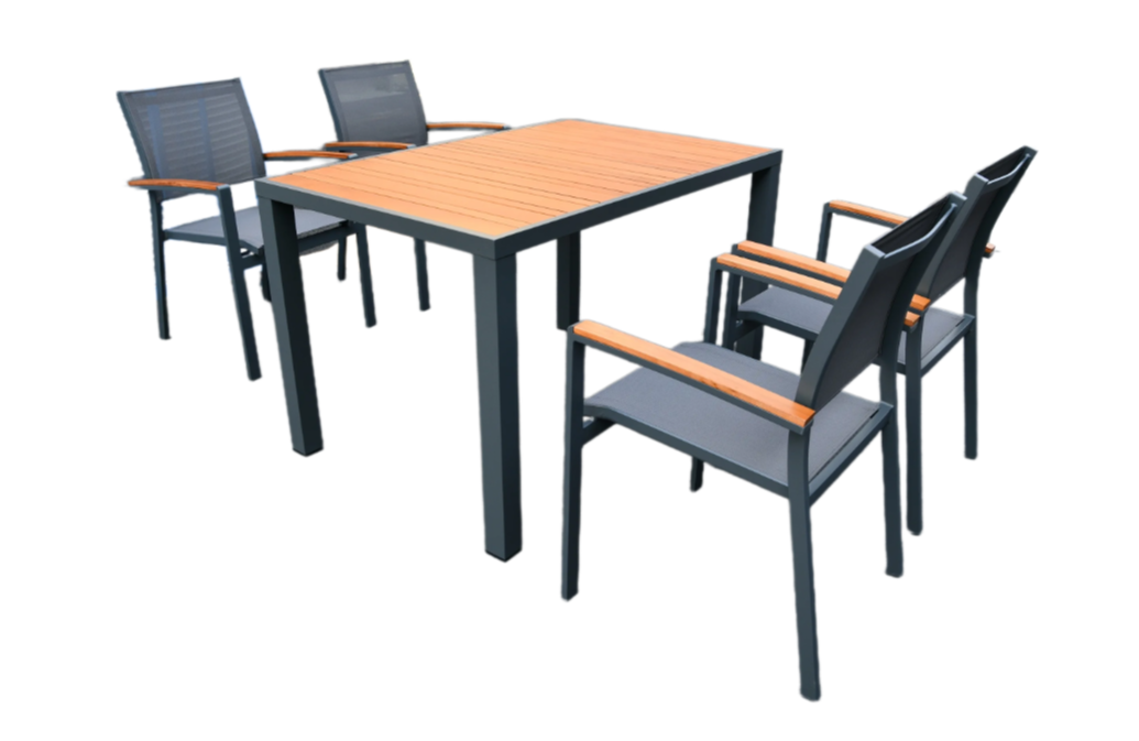 Transform your outdoor space into a stylish, comfortable dining area with the Atlas 1200 5pce Eucalyptus Outdoor Dining Setting. This set combines the elegance of eucalyptus with the durability of aluminum, providing both sophistication and practicality for your patio, garden, or balcony.